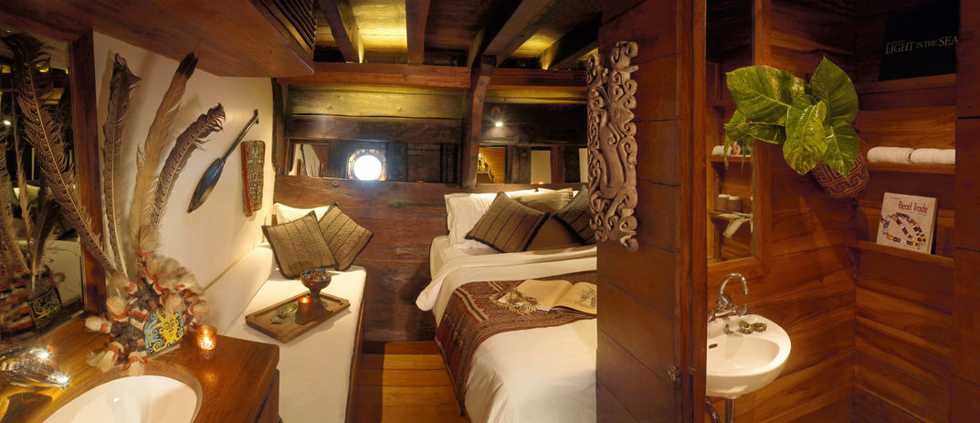 Built by the Master Konjo boat builders of Sulawesi, 50 metre Silonia was launched in 2004 and hosts ten guests in sumptuous style. Paying homage to Indonesian heritage and design, this elegant vessel offers a warm and inviting interior filled with evocative décor and tribal art, with cabins specifically themed to different regions of the archipelago.