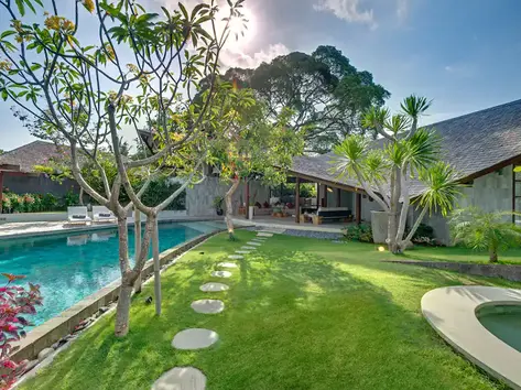 This villa is a spectacular design-led villa resort in the heart of chic Seminyak, with moments from Bali’s best restaurants, boutiques, and sunset beach bars. Cutting-edge contemporary architecture and ultra-chic interiors characterize the 23 villas. This villa offers a choice of one-, two-, three- and four-bedroom villas, each with its own distinctive design and all with an uncurbed feeling of space and openness. This villa's stone slabs across a lily pond lead into an open-plan living room that flows around contoured and angled walls towards the garden.