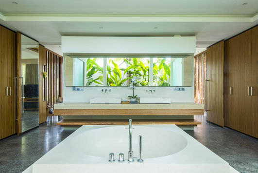 This exclusive five-ensuite bedroom family friendly habitat of avant garde polished concrete ceilings walls and floors, glistening ponds and a spectacular 30-metre wall of glass that opens to large and luxuriant tropical gardens. It is a quiet retreat with luscious lawns, roof top gardens and trees heavy with the heady fragrance of the flowering frangipanis over the infinity pool, bordered by sunbeds and beanbags. A covered games area, which allows for a game of pool or table-tennis is available alongside the al-fresco bar.
